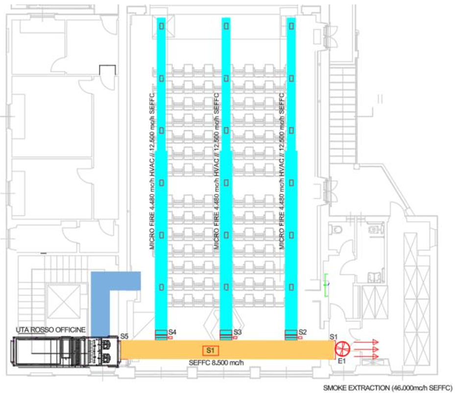 Nell'esempio si riporta una situazione tipica in un teatro, dove vengono installate 4 condotte microforate con portata di 3.350 m3/h (HVAC) e 11.500 m3/h (Smoke extraction).
